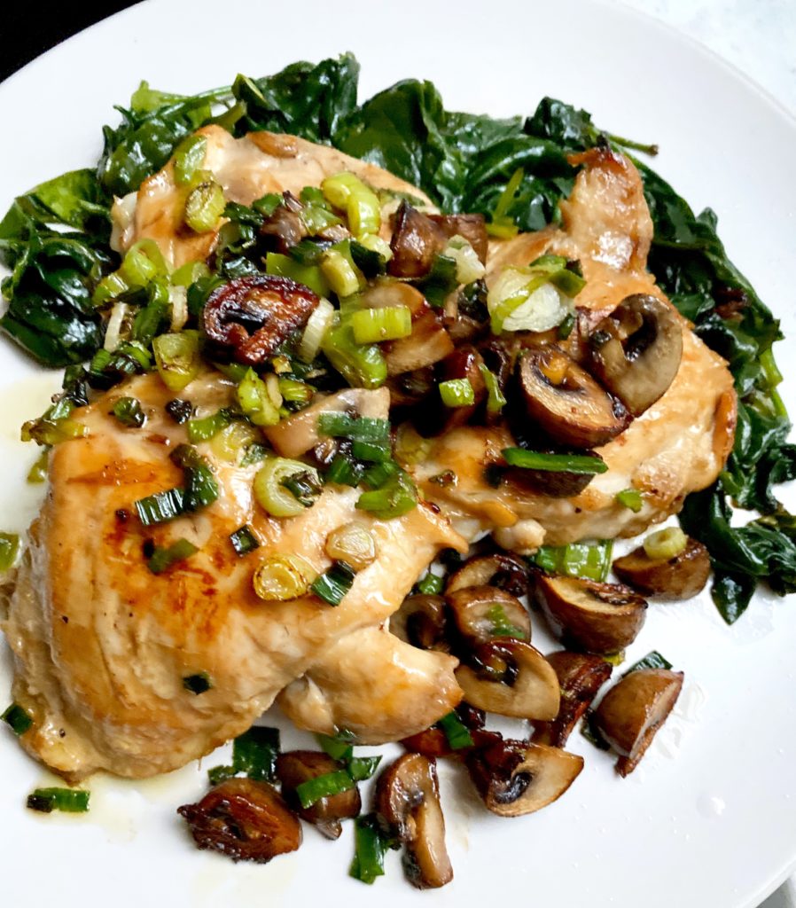 ②フライパンでオリーブオイル大さじ1を熱し、鶏肉を入れて中火〜強火で片面を5〜6分ほど焼きます。鶏肉をひっくり返して、マッシュルームを加えて鶏肉の焼き汁に絡めてから蓋をします。中火で14〜16分焼きますが、その間マッシュルームを焦がさないために数回ヘラで混ぜます。
